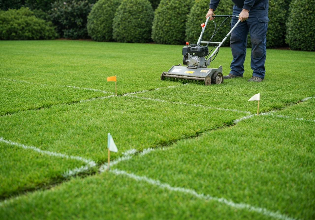 Przygotowanie trawnika Usunięcie przeszkód, niskie koszenie (2–4 cm), optymalna wilgotność gleby